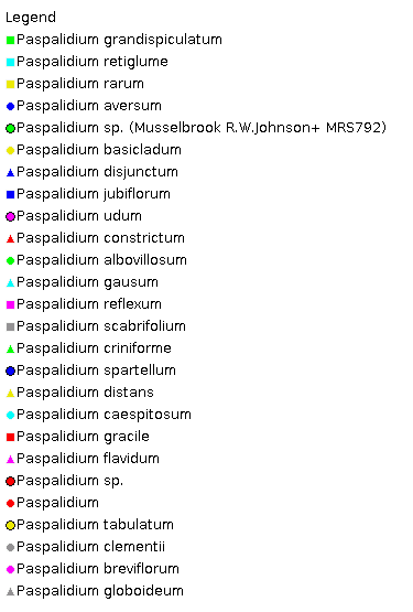 Notes. Typically the genus has distant racemes with neatly imbricate spikelets, which seem very different from Setaria. In fact the gap is bridged by intermediate species with looser racemes so that the diagnostic criterion -most of the spikelets lacking bristles- is rather arbitrary, though seldom difficult to apply. The rachis tip is easily overlooked and the genus can then be confused with Urochloa or Panicum (Clayton and Renvoize, 1986). Some agrostologists (Veldkamp, 1994; Webster, 1995) maintain that because there is a continuum in variation of the bristle arrangement between Paspalidium and Setaria, the generic separation is difficult to apply, and they place all species of Paspalidium under Setaria (B.K.Simon).