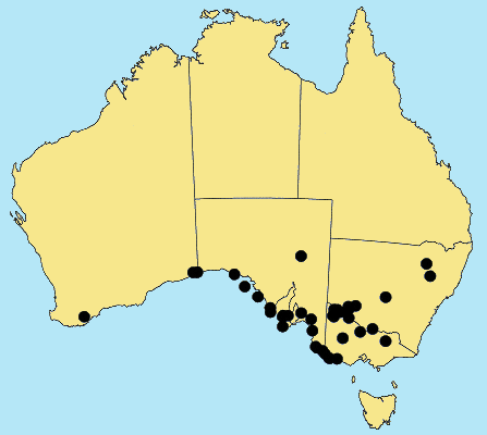 southern Australia. Usually in samphire swamps, margins of salt lakes or