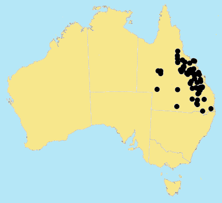 Endemic; fairly widespread in subtropical Qld. Grows in clay and loamy soil, particularly common in Brigalow (Acacia harpohylla) vegetation; flowers all year except Aug.
