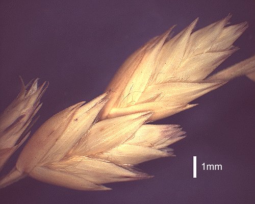 its lemma; often long-hairy leaves and presence of droplets of a brown